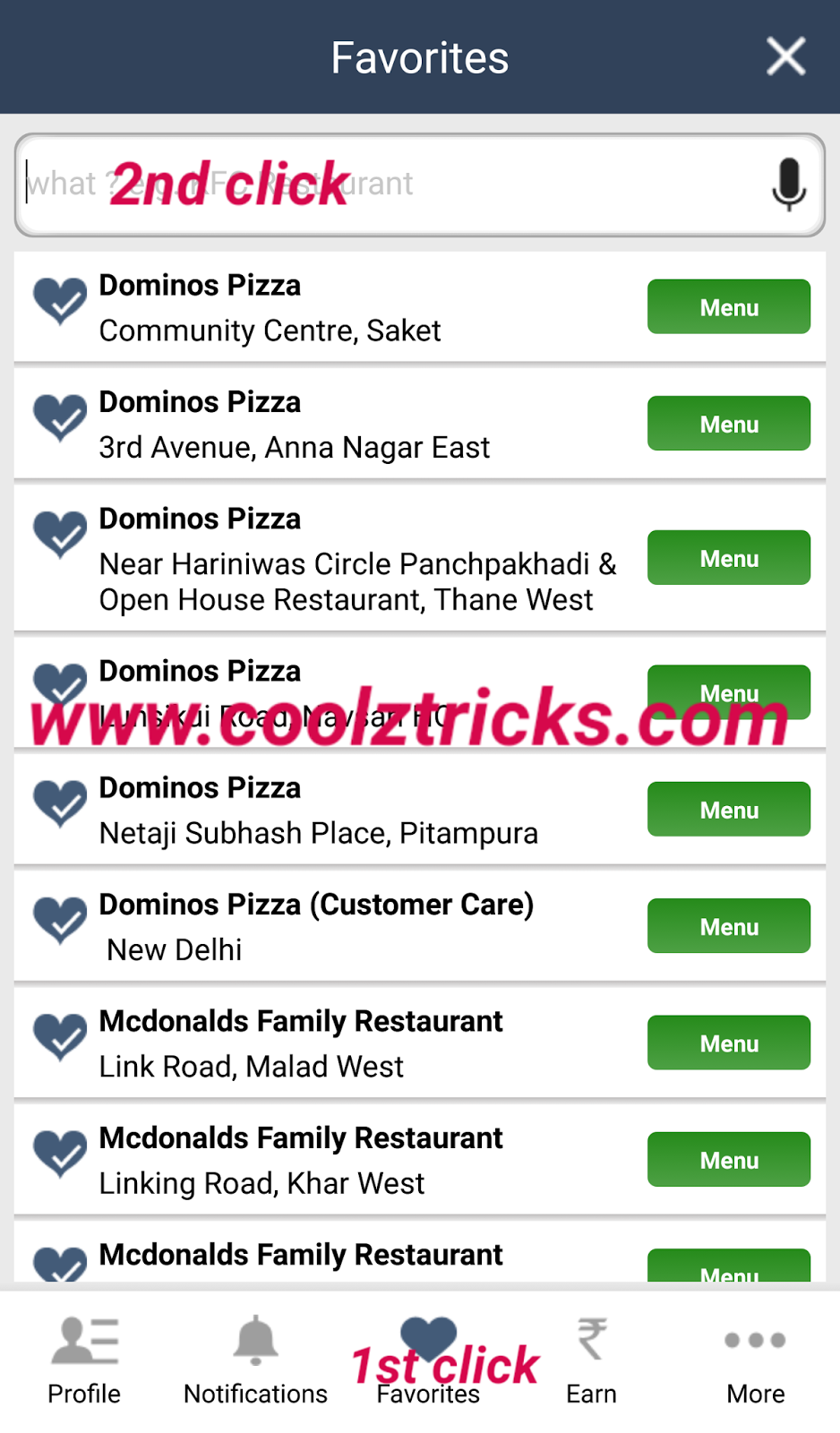 3. Search for anything like dominoz / Mcdonalds / kfc etc. And click on ” โก ” any business as in picture and further do clicks as in picture posted by coolztricks.