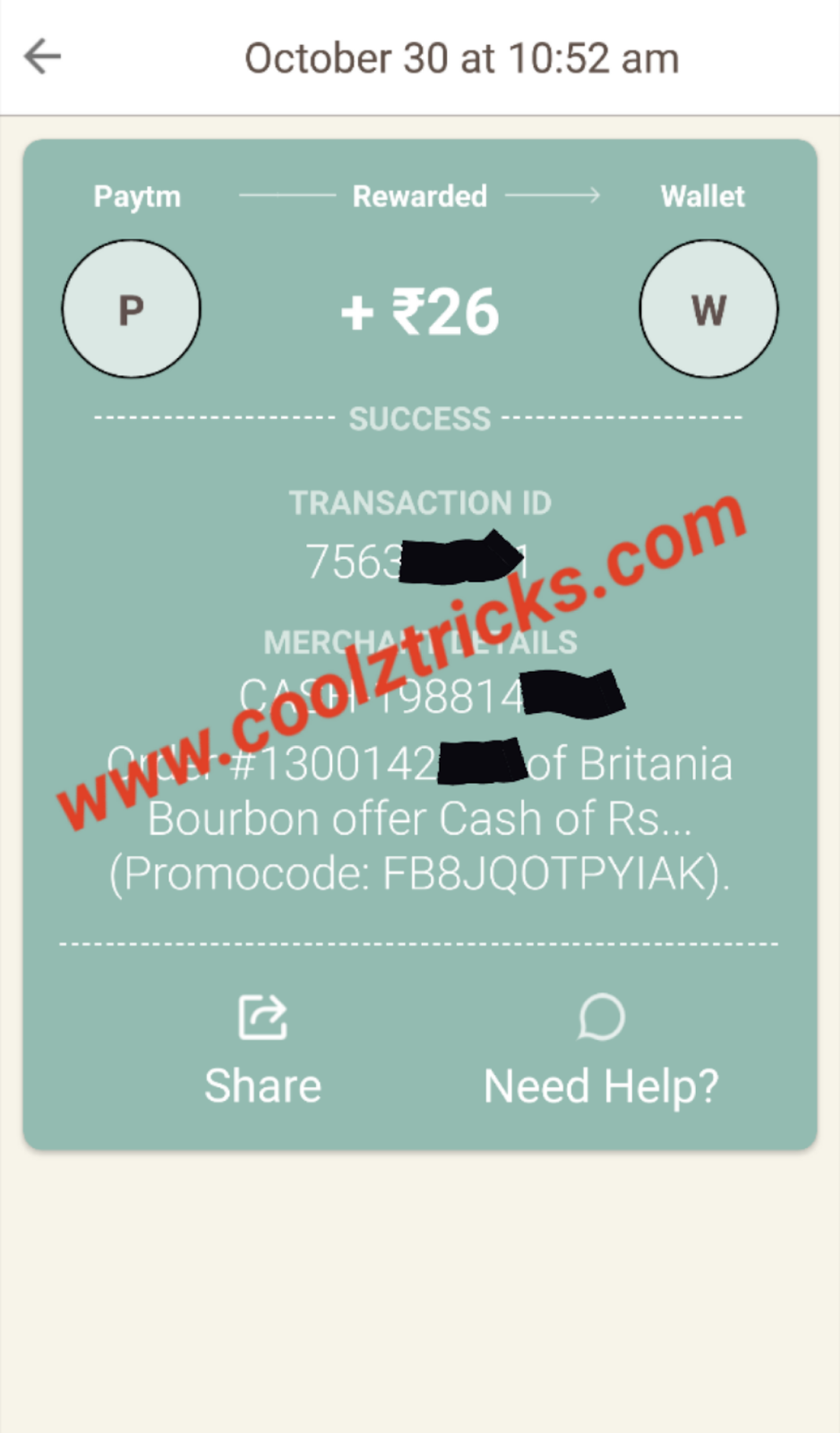 Here is the proof of getting paytm wallet cash from britannia bourbon biscuits codes :